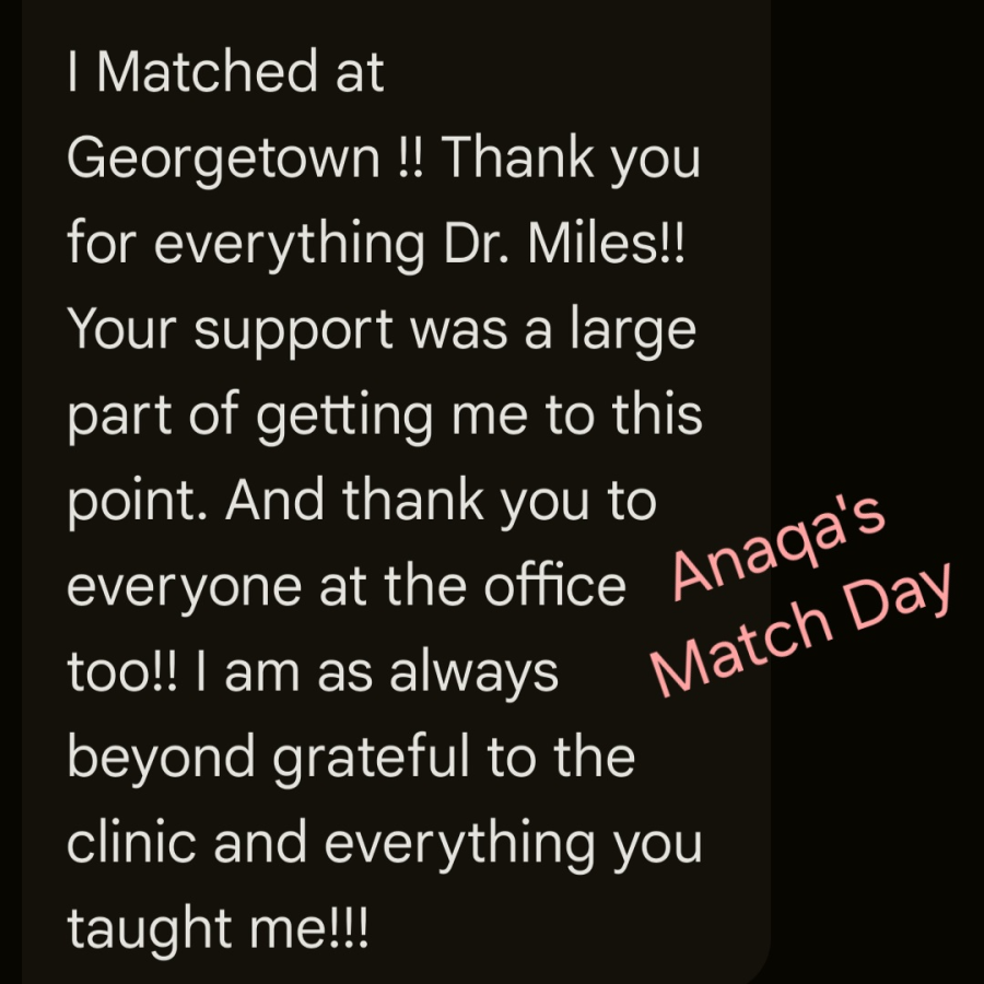 "Dr. Miles' letter of recommendation was invaluable to my application and I had so much fun learning all kinds of random facts (medical or not!) in between patients. I don't think there is another doctor who will come to the office on a weekend to help you prepare for an interview. I will always cherish my time at MFM and I'm happy I got to learn so much while having fun."
